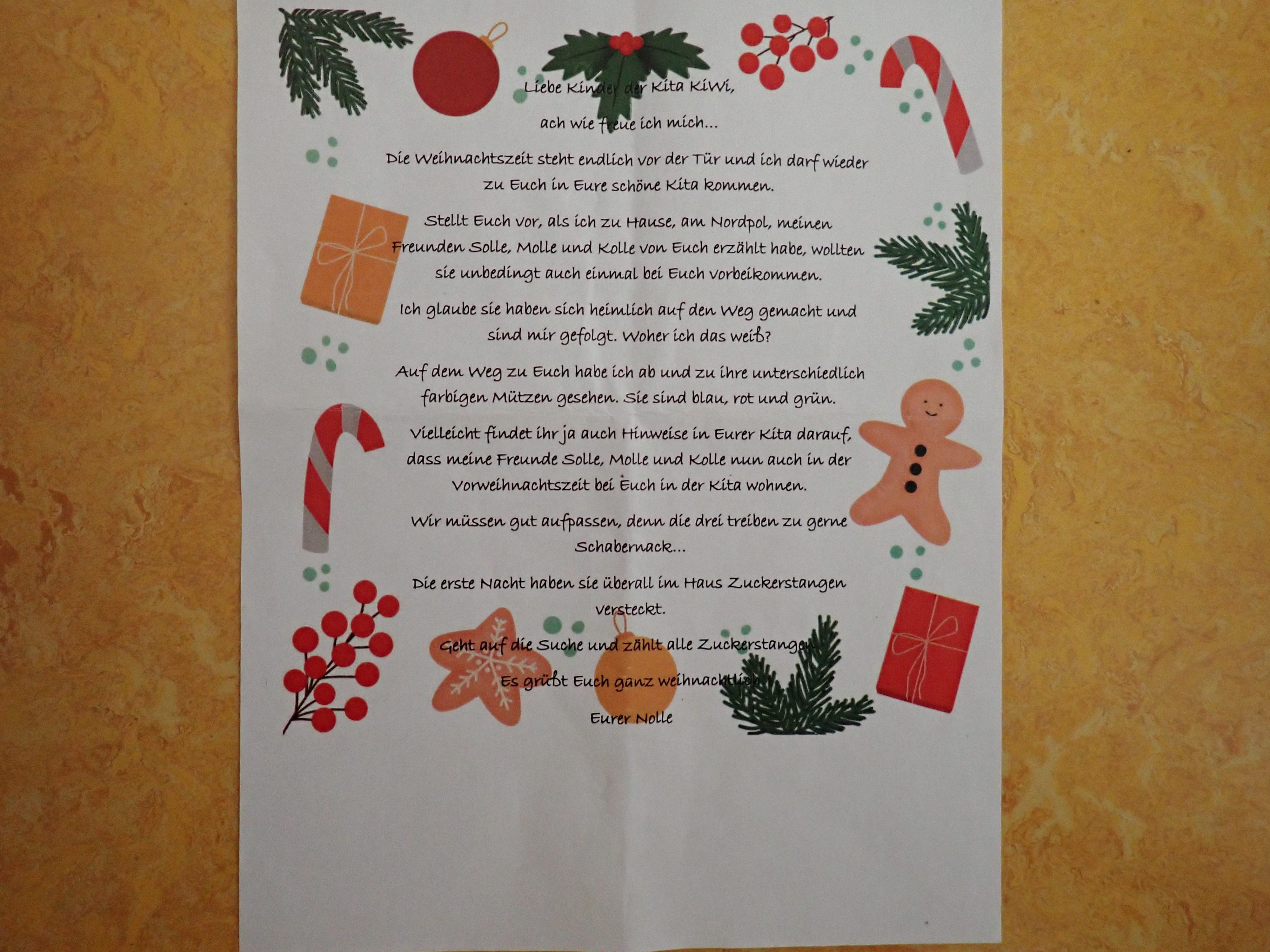 Unser Wichtel heißt NOLLE. Er ist endlich ins Wichtelhaus gezogen. Doch er kam nicht allein. Seine Freunde – SOLLE, MOLLE und KOLLE – waren auch neugierig auf unsere Kita. Diese 3 frechen Schlingel sind einfach mit eingezogen und haben gleich den ersten Schabernack getrieben: Überall im Kindergarten haben sie Zuckerstangen versteckt.