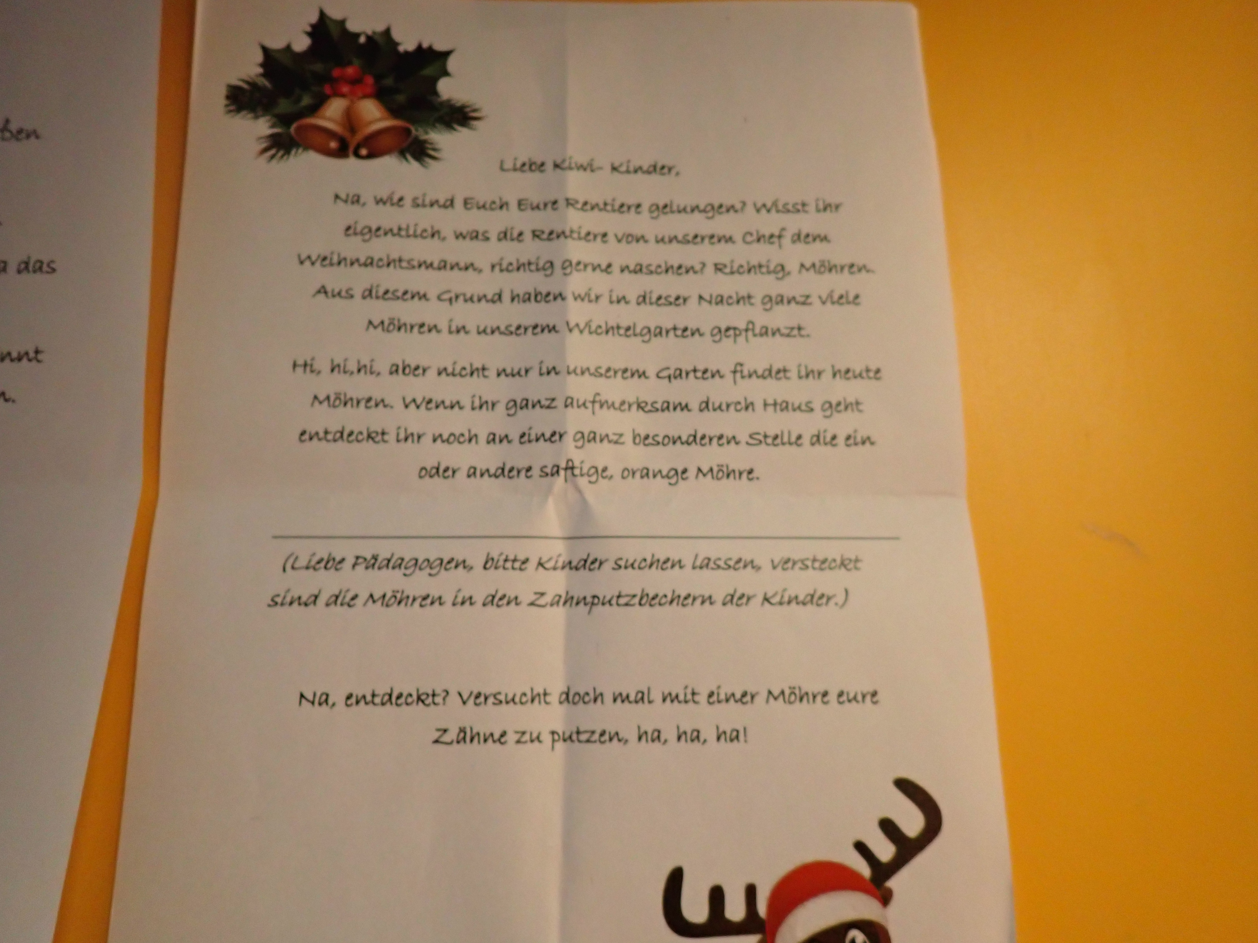 Als wir mittags uns die Zähne putzen wollten, waren unsere Zahnbürsten versteckt. Stattdessen steckten in unseren Zahnputzbechern Möhren. Damit konnten wir keine Zahne putzen. Wir haben aber unsere Zahnbürsten noch rechtzeitig wiedergefunden. Wer will, darf seine Möhre mit nach Hause nehmen. 😉