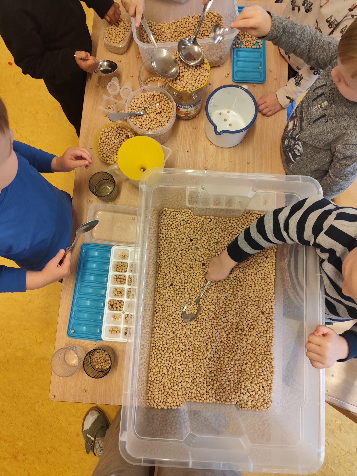 Spiel, Experiment, Sinneserfahrung – wir schütten und sortieren mit Kichererbsen und Muggelsteinen.