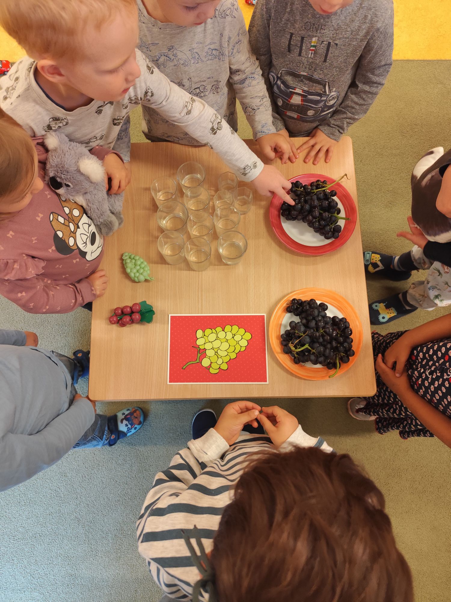 Heute zum Wochenbeginn dreht sich bei uns alles um das Thema Weintrauben.Ich erzähle den Kindern von der Weinlese,wir schauen uns Fotos und Videos darüber an und verkosten natürlich die leckeren Trauben.Auch können wir den zuckersüßen Traubenmost probieren .