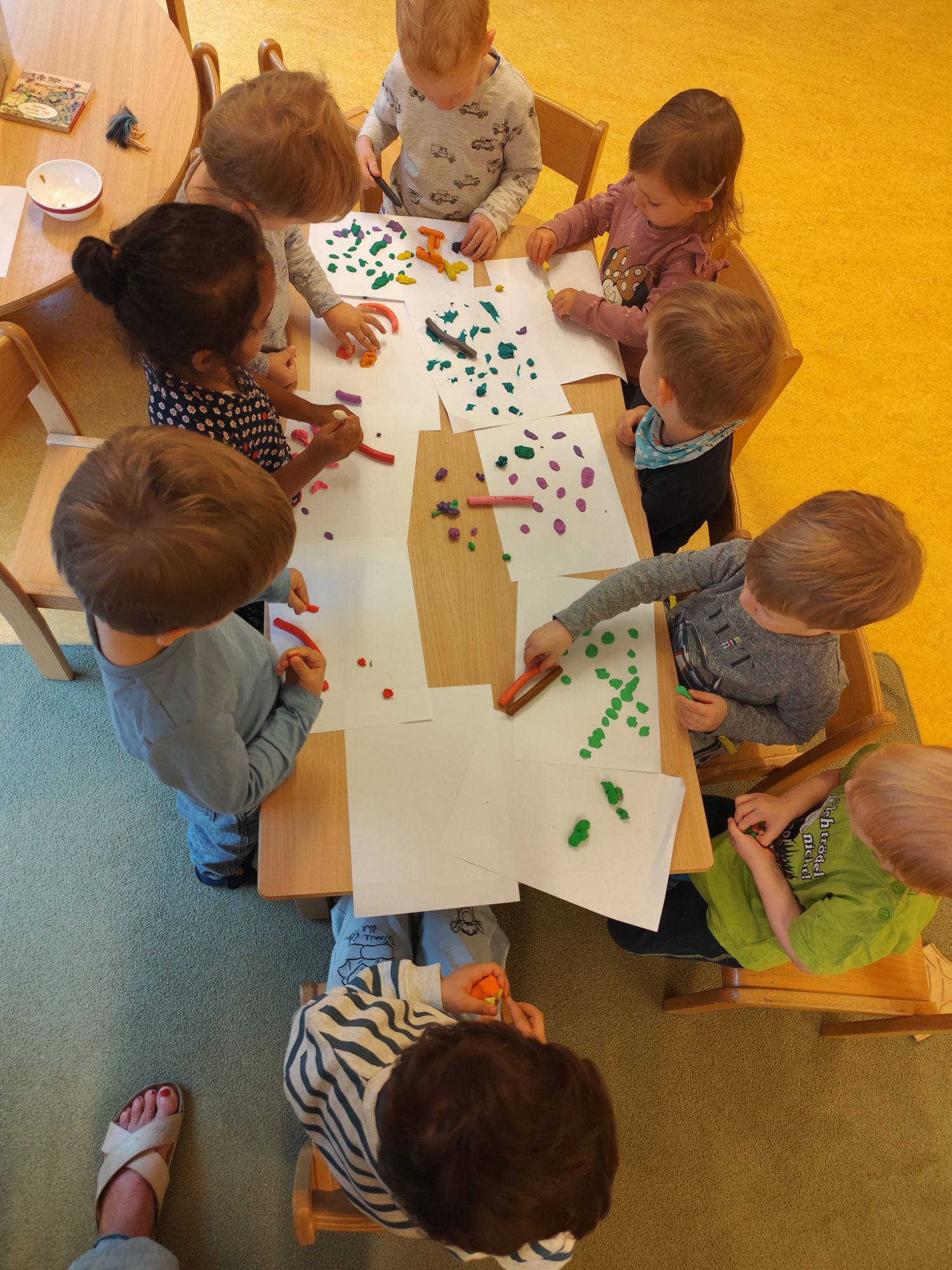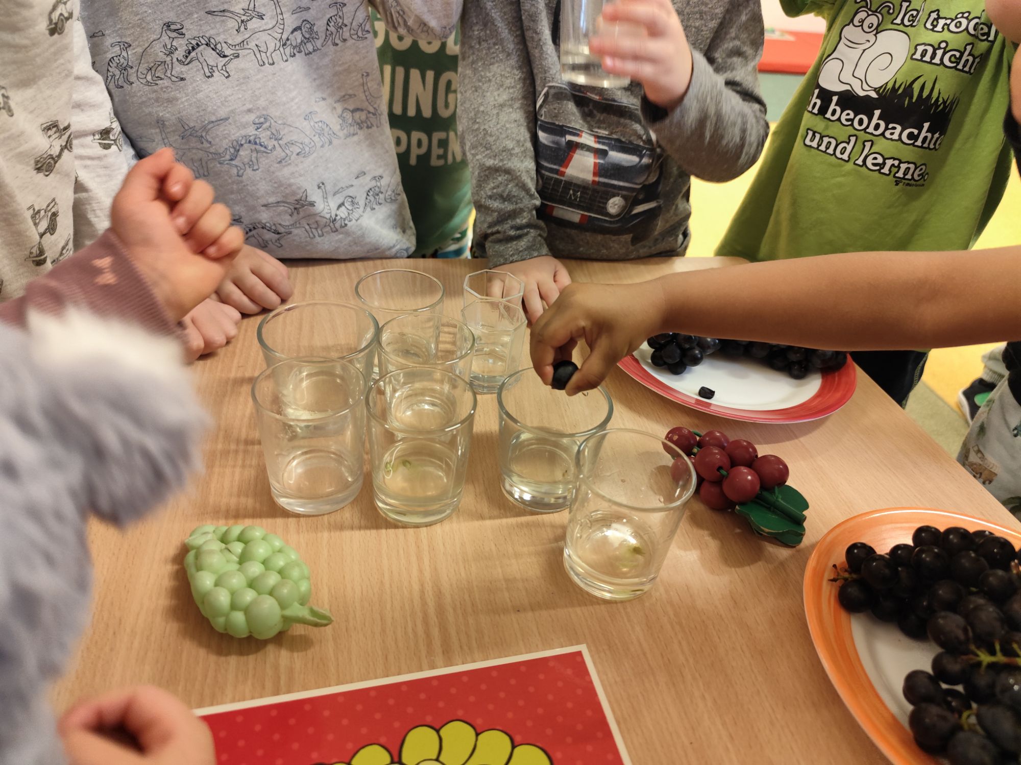 Wir bleiben thematisch ,hören uns das Lied von der Weintraube an und beginnen viele kleine Weintrauben mit Knete zu modellieren….das K netvorhaben nimmt letztendlich einen großen Raum ein und es entstehen viel mehr Kunstwerke, als nur unsere blauen und grünen Beeren ( zu bewundern in der Garderobe).