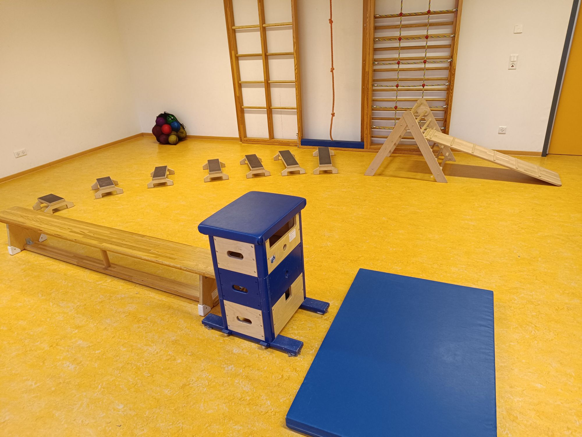 Heute fand eine Bewegungseinheit im Sportraum statt. Die Kinder übten zunächst, auf eine Bank und Stapeltreppe zu balancieren und anschließend von einer erhöhten Position herunterzuspringen. Danach trugen sie einen Ball über Kopf und liefen damit über die Bänke, wobei sie erneut ihr Gleichgewicht hielten. Zum Abschluss bewegten sich jeweils zwei Kinder gemeinsam rückwärts durch den Sportraum. Diese Bewegungsangebote fördern die motorischen Fähigkeiten der Kinder, insbesondere Gleichgewicht, Koordination und Körperspannung.
