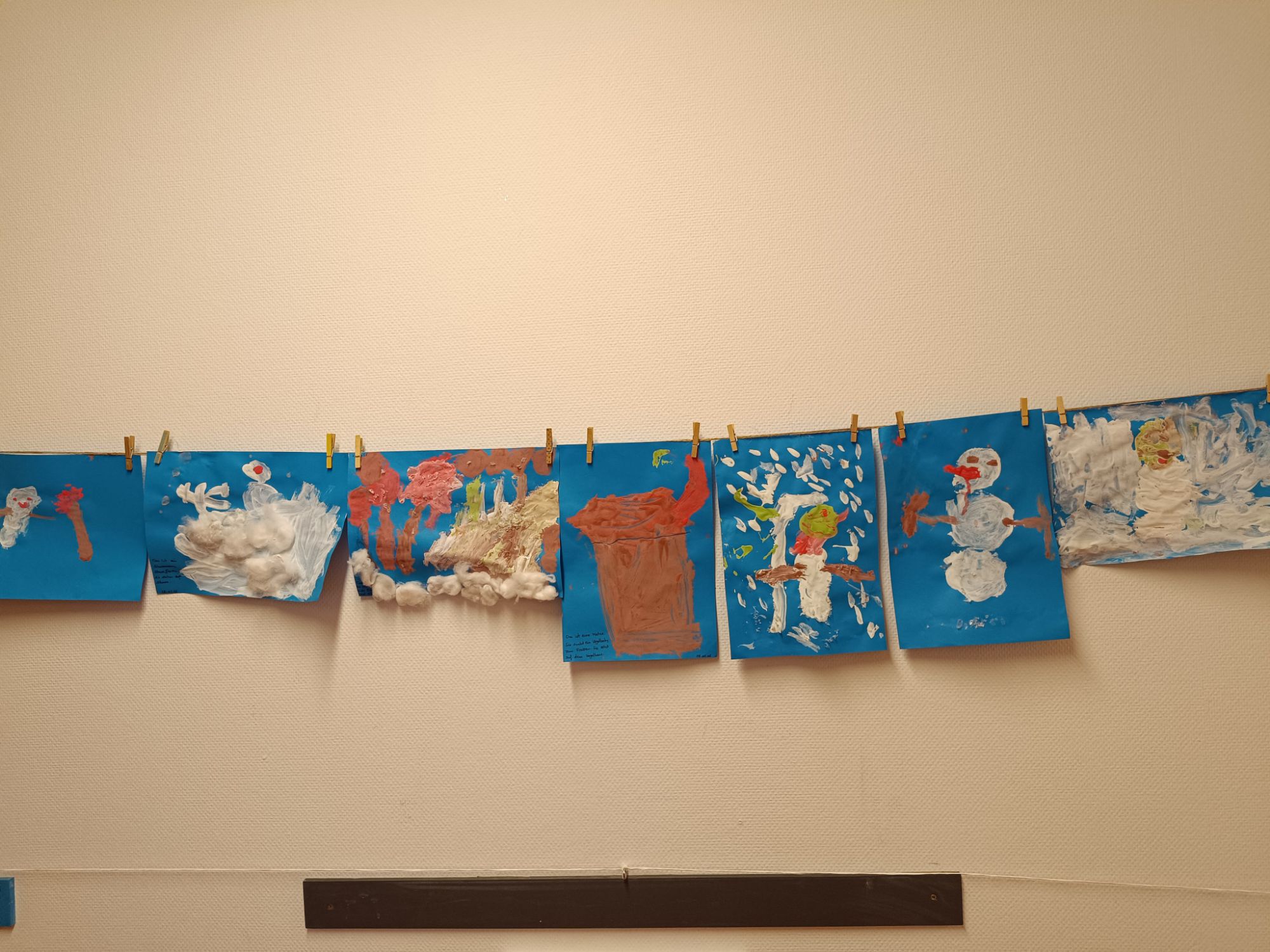Gestern haben die Kinder das Thema Winter aus ihren eigenen Perspektiven mit verschiedenen Materialien gestaltet. Dabei verwendeten sie Acrylfarbe, Fingerfarbe, Watte und Streuschnee.