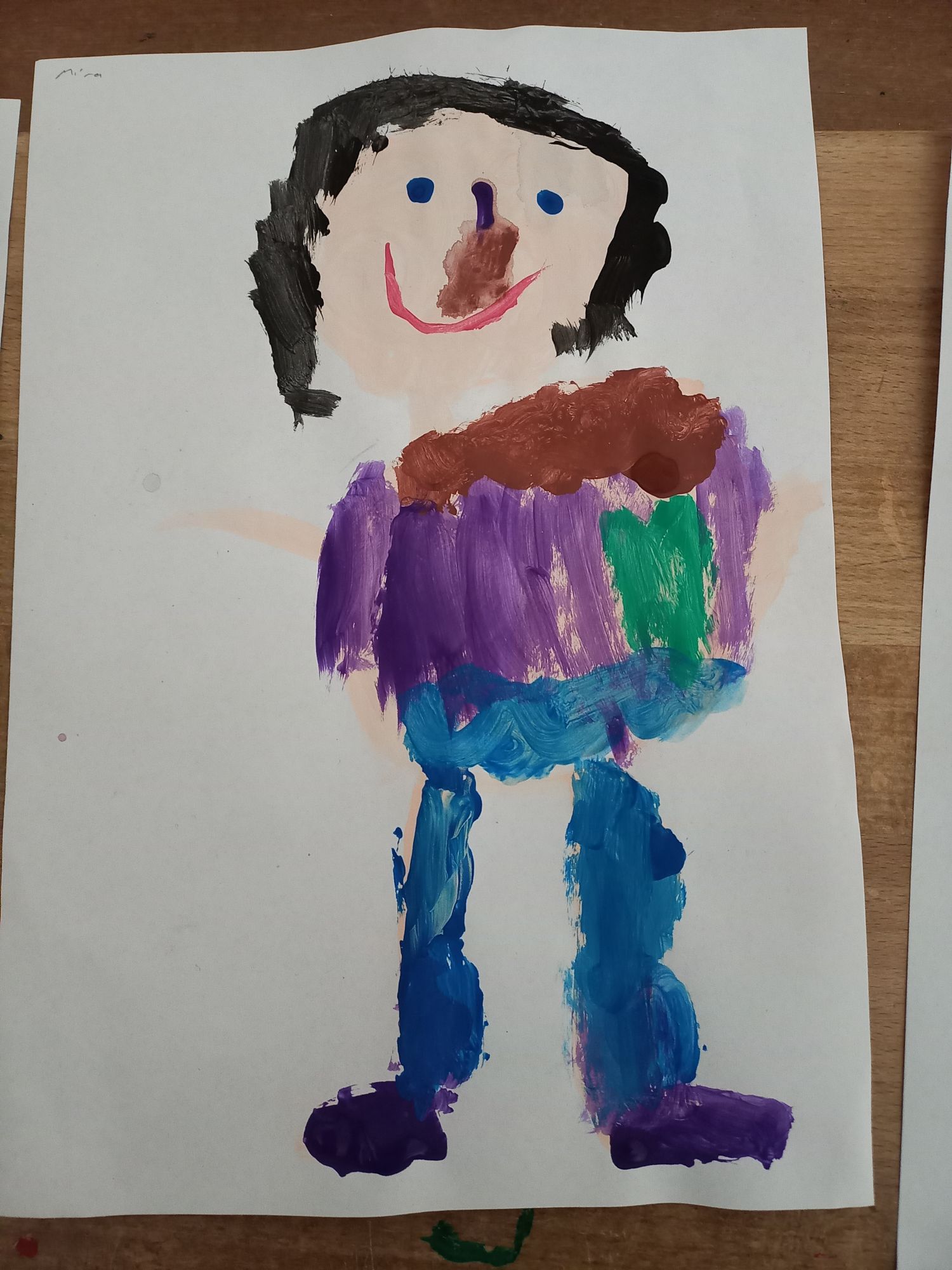 Zuerst malen wir einen Nackedei und malen Kopf, Hals, Bauch, Beine und Arme. Anschließend gestalten wir den Menschen.
