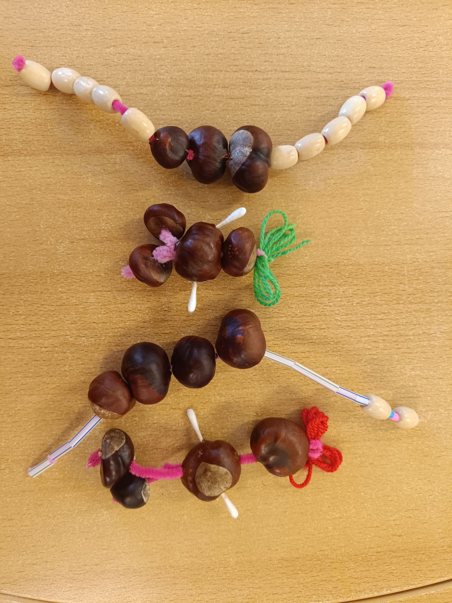 im Rahmen der Förderung der Feinmotorik beim Fädeln, Kleben und Gestalten sowie zur Anregung der Kreativität und Fantasie der Kinder haben wir heute mit Kastanien gearbeitet.