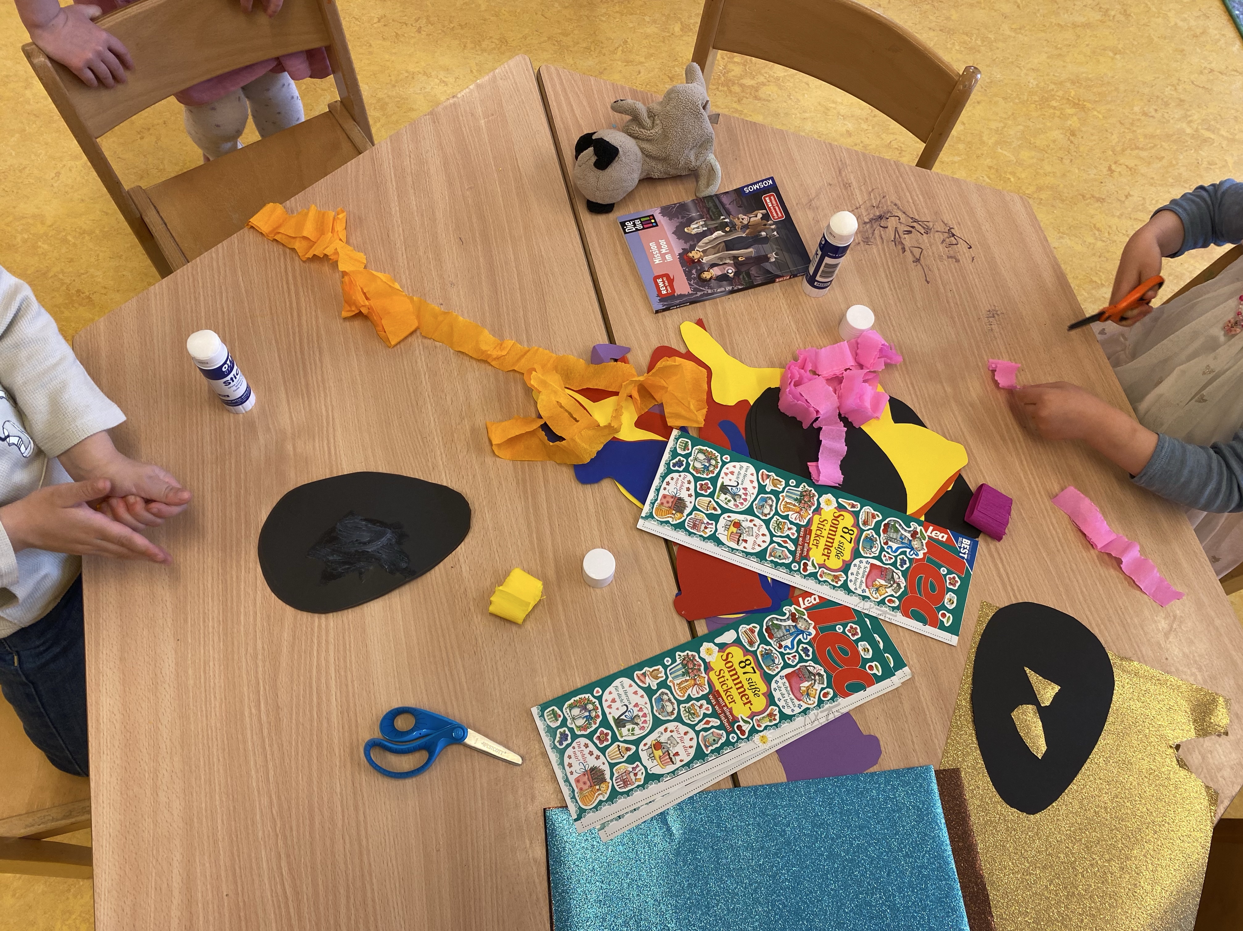 Die anderen Kinder basteln etwas für den Osterhasen. Die Kinder wollen ihm wieder einen Brief schreiben. Morgen wollen wir ihn dann zum Briefkasten bringen und losschicken.