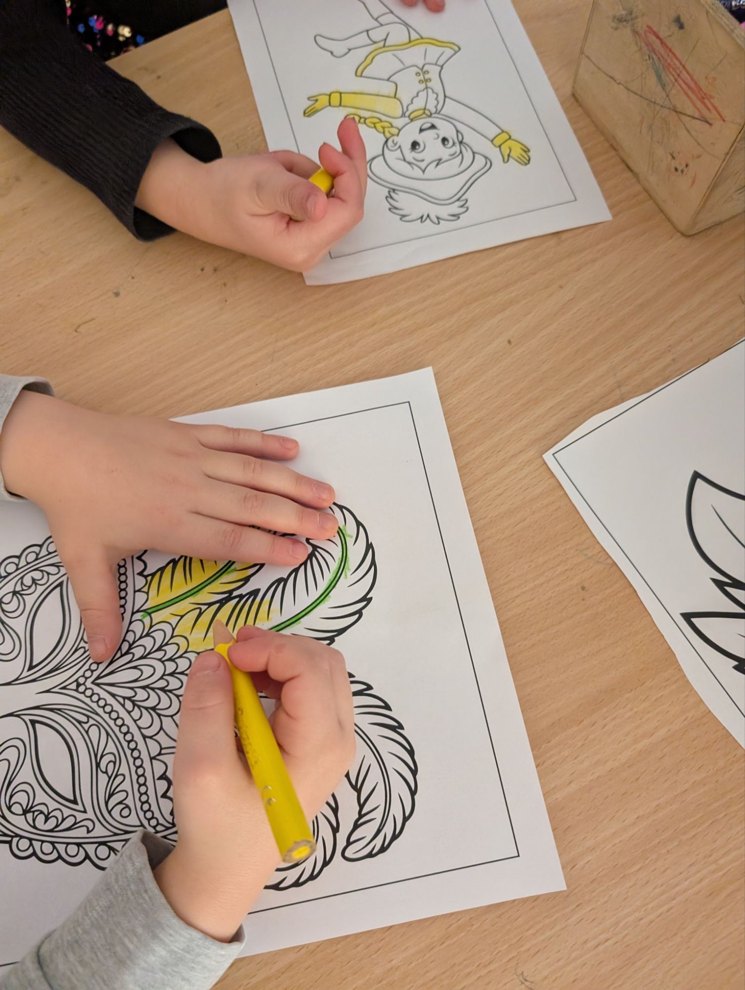 Zudem haben die Kinder die Möglichkeit, bunte Masken für das Faschingsfest auszumalen und zu schneiden. Wer möchte, kann aber auch einen Clown oder einen verkleideten Jungen/ verkleidetes Mädchen ausmalen.