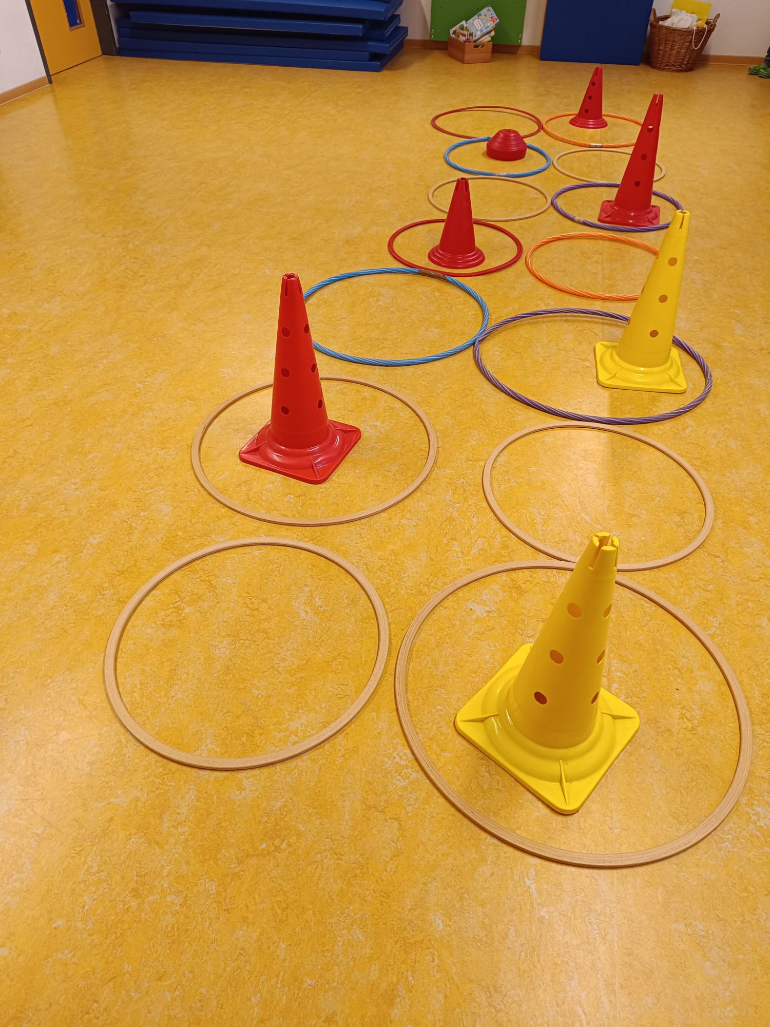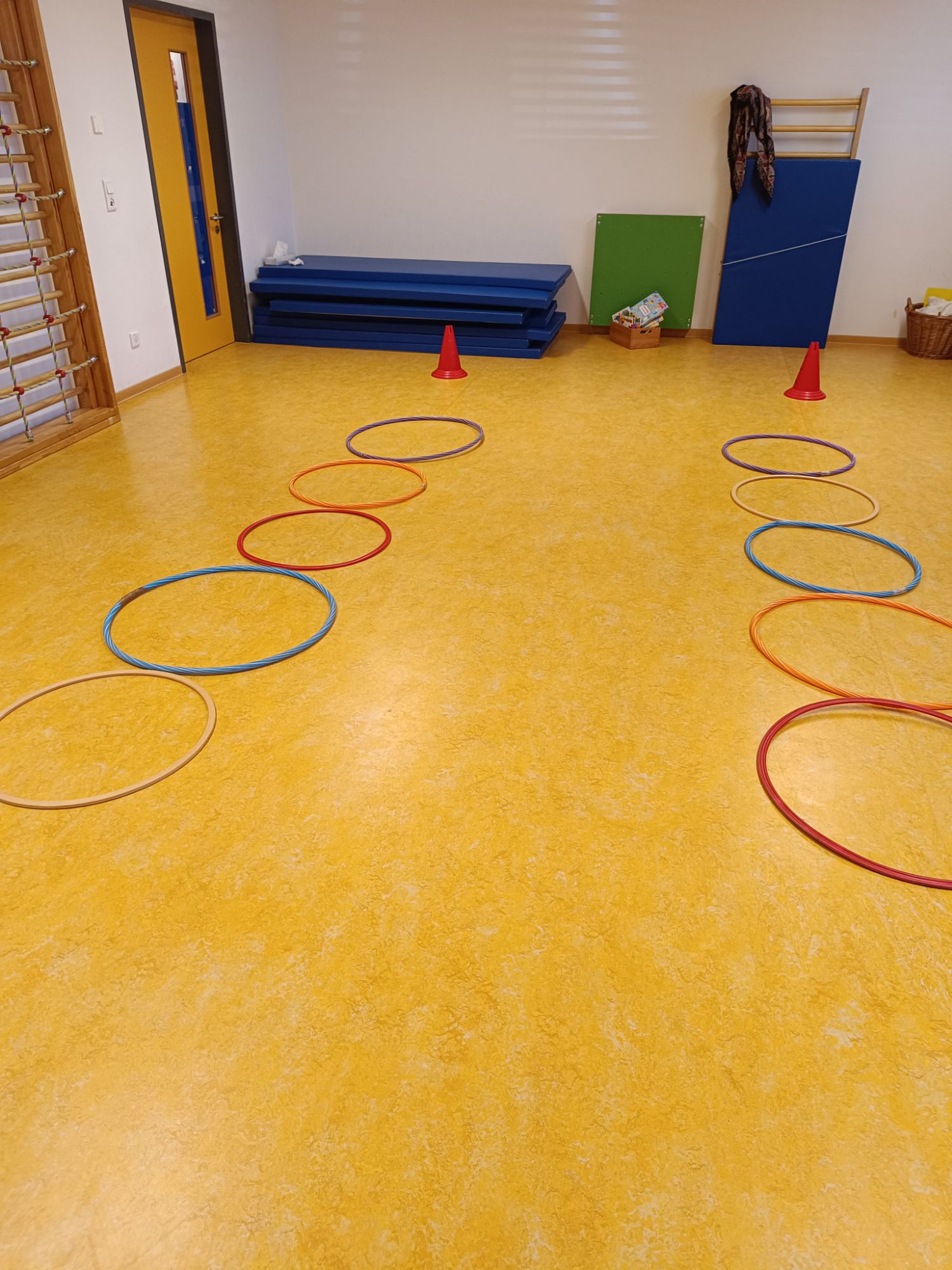 Heute hatten die Kinder im Sportraum viel Spaß bei verschiedenen Bewegungsspielen. Sie spielten mit Reifen, Sitzmatten und anderen Materialien. Dabei konnten die Kinder hüpfen, Reifen sammeln und ihre Koordination sowie Beweglichkeit trainieren.