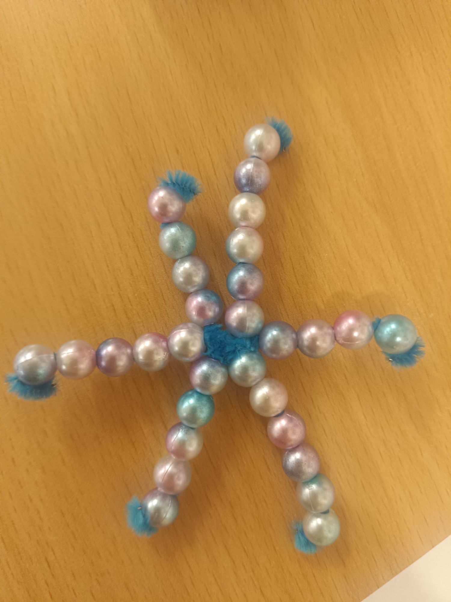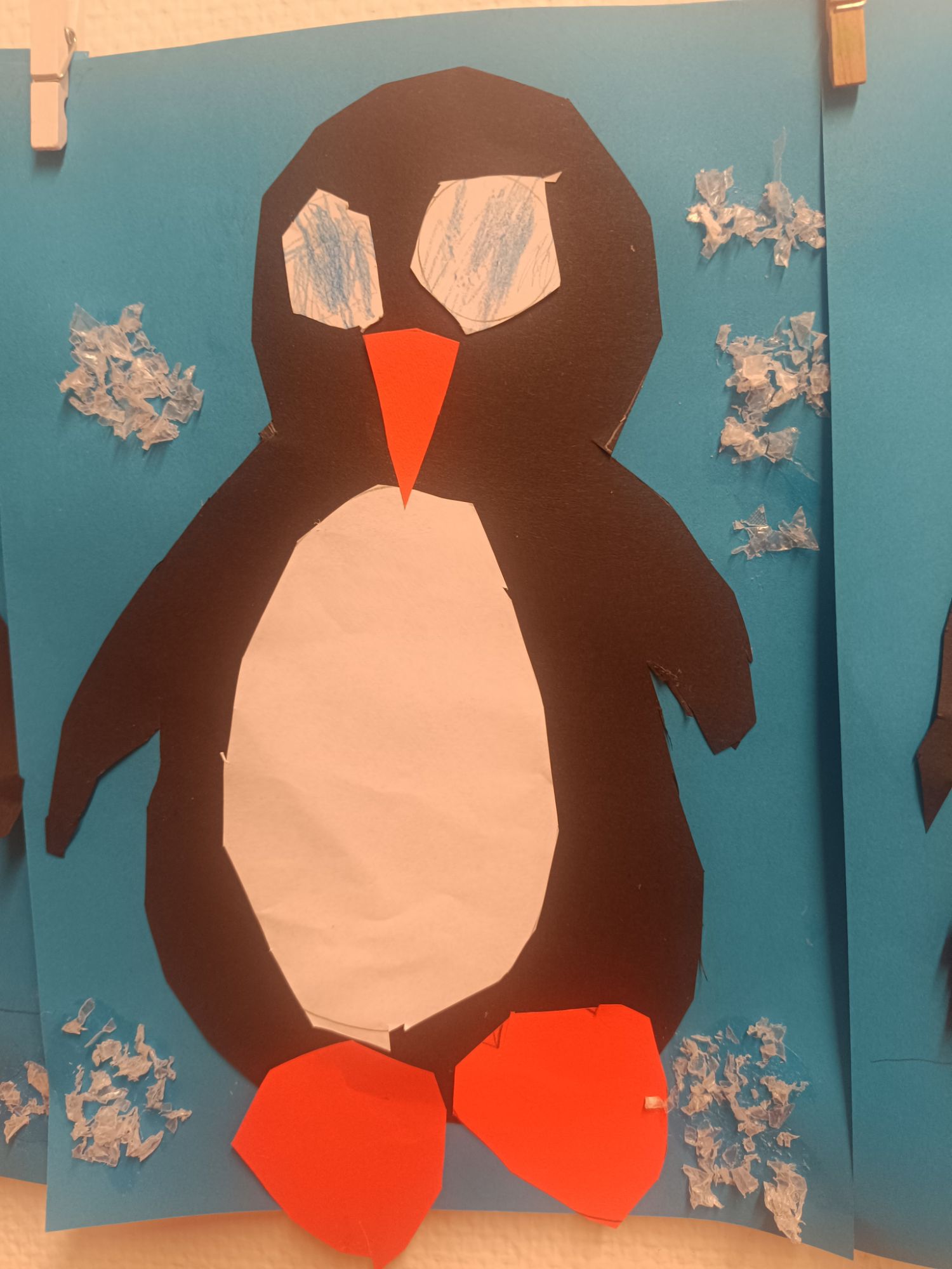 Die Kinder haben sich mit dem Thema Winter und Schnee beschäftigt. Dabei haben sie verschiedene Bastelarbeiten gemacht. Die Kinder haben einen Pinguin aus Papier gebastelt. Außerdem haben sie Schneeflocken und Figuren aus Perlen und Pfeifenreinigern gelegt.