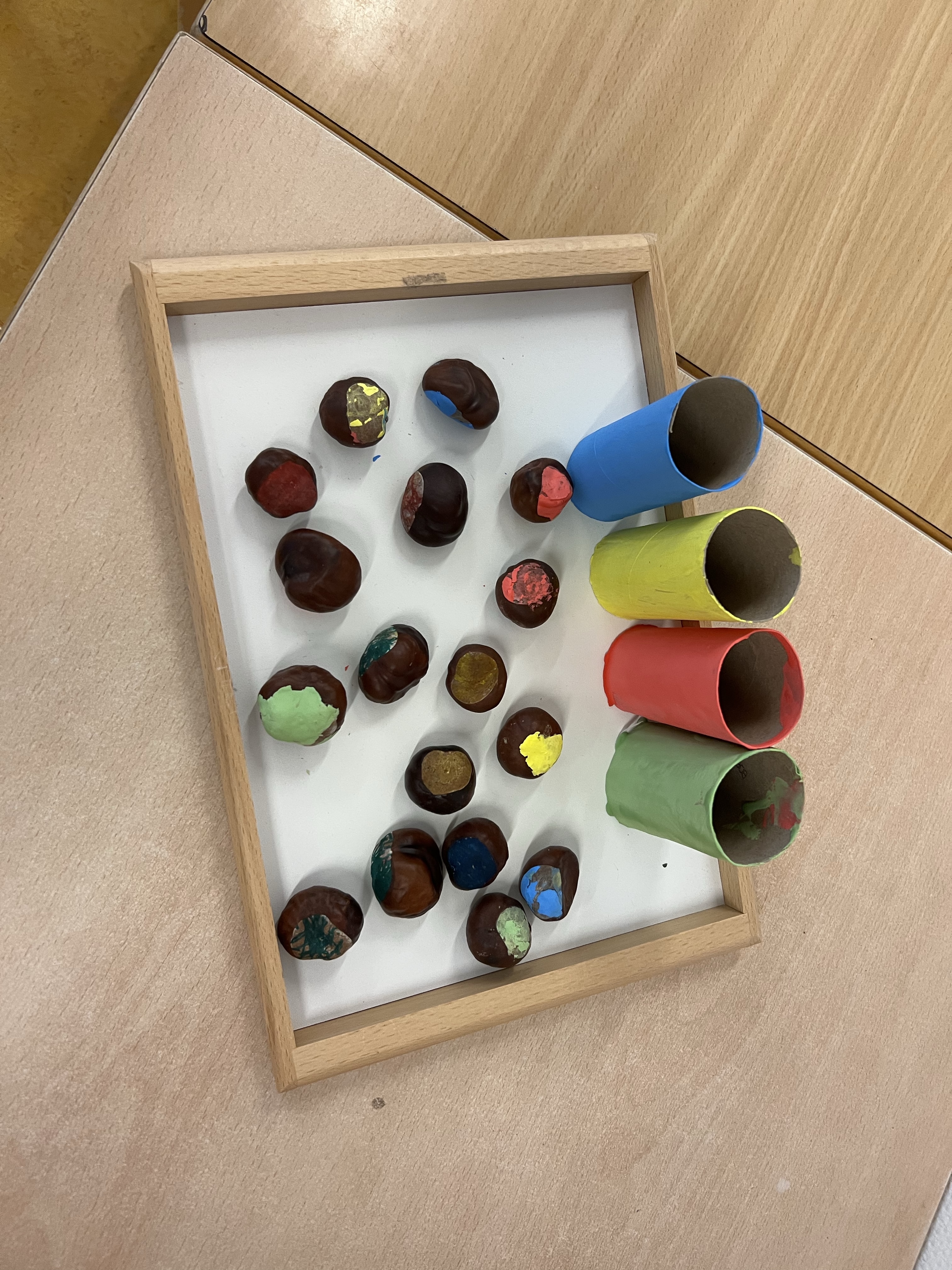 Ansonsten ging es weiter mit dem Herbst und besonders die Kastanien 🌰 standen im Vordergrund. Wir sangen Lieder und ordneten die Kastanien zu verschiedenen Farben.